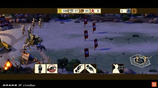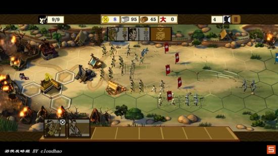 先说说游戏画面吧,战斗界面非常有意思,其背景就是一幅卷轴式的水墨山水画,不时有鸟从上空飞过。仔细看的话,房屋着火和风吹草动这些细节都能表现出来,打了几关后还下起了雨,对火枪部队造成影响。游戏刚开始的时候,有好几个部队在交战,给我印象最深的是一个武士将刀刺入一个小兵的身体,感觉很真实。各个兵种的动作比较丰富,并不会输给大型的战略游戏。甚至同一个部队中的人物在进攻时都会有不同的动作,和不同兵种的交战居然有不一样的动作表现。当小兵捂着胸口倒下的时候,我只能承认其细节非常到位。