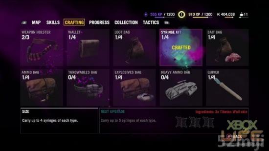 在美丽又壮阔的 Kyrat 地区,野生动物的生态系非常丰富,当然重返 Kyrat 的 Ajay 已算是个美国人,对枪械虽然并不陌生,但能开枪打死一堆野生动物这可是新奇的体验啊!打猎是游戏中非常重要的一部分,在 Kyrat 地区内的野狼、马来膜、山猪甚至是犀牛等动物都可以变成非常有用的素材。在游戏中总共有 8 个栏位可以升级,分别是枪套、钱包、道具袋、治疗针袋、诱饵袋、弹药袋、投掷装备袋、炸药袋、重型弹药袋以及标套。这些栏位提升后都可以获得额外的装载量,但要提升这些栏位的唯一手段就是必须要打猎,接著剥下动物的皮革后自己来製作。当然不同动物的皮革也会对应不同的升级栏位,但基本上升级的方式都是相同的。