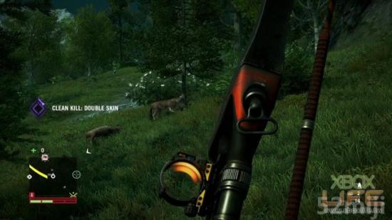 而打猎当然是一门学问,除了要注意动物的攻击方式之外,选用的武器也是非常重要的。基本上枪械拿来打动物是非常有效的武器,但由于火药的威力太大,常常打死了动物之后兽皮也千疮百孔了。所以在游戏中打猎最有效率的武器其实是弓箭与砍刀,这两把武器都能在杀死动物之后保留完整的兽皮。在游戏中只要是用弓箭或砍刀打死的动物,剥皮时都能够获得双倍的兽皮,虽然难度比用枪械来的高,但绝对是更有效率的方式。而在狩猎场时,玩家也可以透过丢出生肉诱饵来引诱肉食动物出现(犀牛无效),当猎物被肉吸引之后再窝在旁边瞄准头部来个一箭穿脑。这样的方式除了可以不用自己东跑西跑找猎物之外,诱饵以及箭矢都能够在剥皮时同步回收。