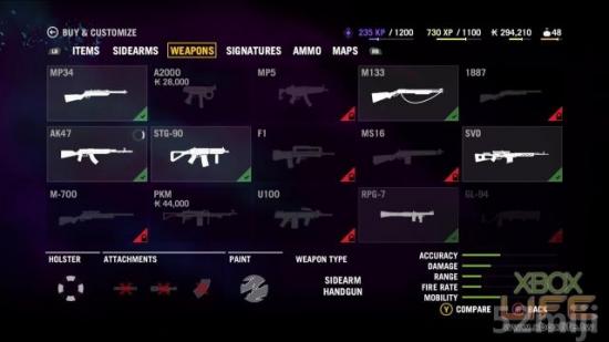 贝根.明的手下虽然人多,但都是一些不三不四搞七捻三的烂咖,Ajay 这麽优秀的战士当然不会自甘堕落的去跟他们搞在一起!虽说如此,但想要顺利打败敌方部队,该要有的装备还是得要带齐,毕竟敌方哨子一吹人可是比我们还要多上好几倍。在游戏中玩家可以选择的武器种类非常多,主要武器包含步枪、狙击枪、衝锋枪、弓箭、火箭抱以及轻机枪,不同的武器都使用不同的弹药。除此之外,许多武器都可以自由加装配件,例如瞄具或者是灭音器等,客製化自己的武装才是正港的男子汉!在战斗中,弓箭可以用来无声杀敌,虽然速度慢且需要拉弓时间,但可以完全隐藏自己的踪迹,而武器装上灭音器之后也能获得一样的效果。以上这些好料,都可以透过游戏中取得的货币来购买,大部分的武装也会随著游戏进度而逐渐解锁。