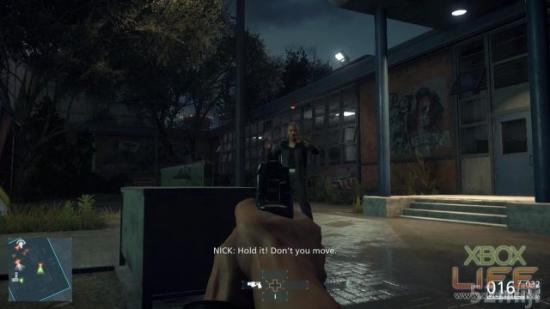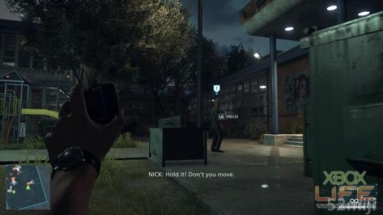 而身为警探而非军人的玩家们,非到不得已否则当然是尽可能避免使用过多的暴力,在游戏中也因应这样的警察风格所以加入了逮捕的系统。当玩家在敌人没有注意到的情况下,可以直接亮出警徽表明身分,这时候敌人会有想要反击或者是逃跑的欲望,玩家就必须要把枪的目标对准敌人。而这个系统可以让玩家一次解决多个目标,但由于敌方都是法外之徒,所以直接表明身分也伴随著一定的风险。当玩家亮出警徽时,敌人头上就会显示出威胁量表,当量表满时敌方就会立刻回击。而要让量表保持在低点的方法,就是必须要在亮出警徽之后给予敌方压迫,拿枪对著敌人让他不敢轻举妄动,这时候玩家就可以向前逮捕对方。虽然说比起撂倒或者是电击枪,逮捕的手续比较複杂同时难度也比较高,但逮捕也同样的伴随更多的经验值奖励,玩家可以依照自身情况来决定要如何解决敌人。