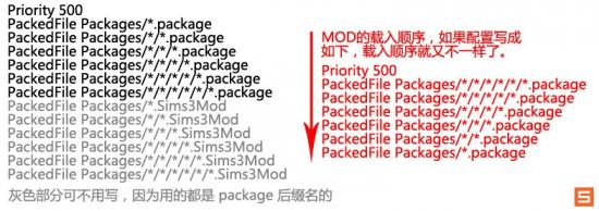 ★文件夹名称,告诉游戏载入MOD文件的文件夹名称,官方形式的游戏内部自动有Mods文件夹分配,所以配置只要写 Packages 即可,当然你也可以用你自定义的名称,如 Skins。全行写法:PackedFile Skins/*.package
