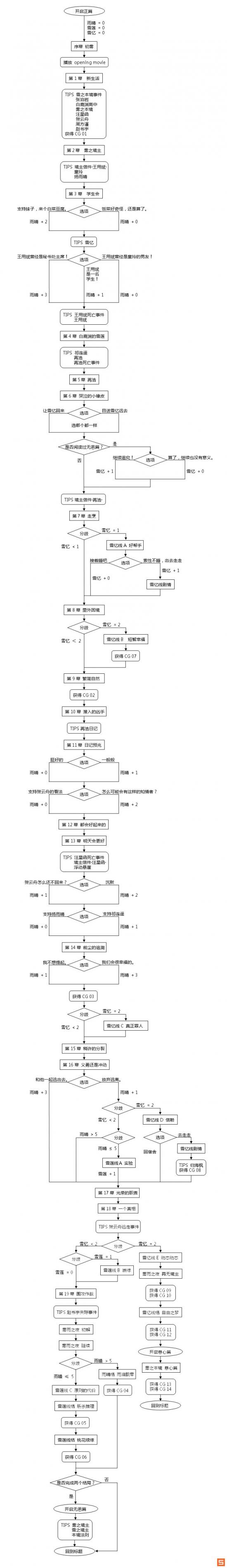 游戏初始,雨晴、雪莲、雪忆3个值均为0。当雨晴数值较高时会进入雨晴结,较低时进入雪莲结。雪忆达到一定值以后,优先进入雪忆结