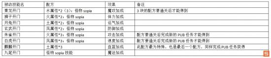 说到属性强化加成就不得不提配方(Recipe)。关于配方的获取方式我前面也讲到了,在PUB完成相应任务后获取。前期获取的配方都是两块相同属性的sopia组成的强化技能(四种开门),等级从1到全开,加成百分比为10%、15%、20%。具体如下: