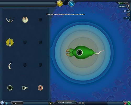 画面放大至行星,出现选择项,从细胞时代到宇宙时代,第一次游戏其他时代不可选择.选择细胞后,游戏会询问你创建的细胞是吃素还是吃肉,像我这样的肉食者当然没有其他选择了。