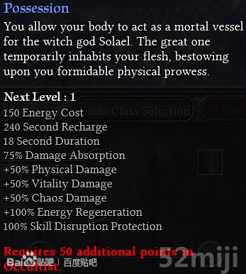 3 18秒持续时间 75%的伤害吸收 +50%物理伤害 +50%活力伤害 +50%的混沌伤害 100%能源 100%再生技能中断保护