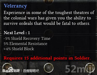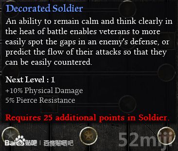 3 功勋卓著 在白热化的战场上保持冷静思考的能力,使老兵能够更轻易地判断敌人的攻防/增加10%物理伤害,增加5%穿刺抗性。