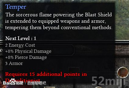 2 煅烧 由魔焰产生的防爆屏障触碰到武器和护甲,通过一种非常规方式煅烧它们。 1级 2能量消耗 +8%物理伤害 +8%穿刺伤害 3点护甲。