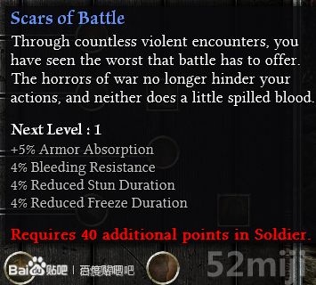 4 百战之躯 经历了无数战火洗礼,没有任何在战场上没见识过的事,战争的恐怖和小小的伤口,都已阻止不了你了/增加5%护甲吸收,增加4%流血抵抗,减少4%眩晕时间,减少4%冰冻时间。