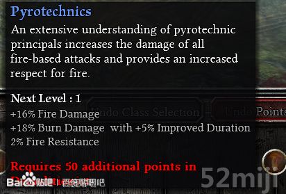 3 烟火技术 对于烟火技术的广泛理解使得所有基于火焰伤害的攻击伤害提高并且表现了一种对于火焰的敬畏。 1级 +16%火焰伤害 +18%灼烧伤害(+5% 持续时间) 2%火焰抗性。