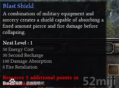 1 防爆屏障 一个物理和魔法结合而产生的盾能够在固定数额的穿刺和火焰伤害造成伤害前吸收它。 1级 50能量消耗 30Scd 100点伤害吸收 8点火焰反击。