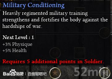 1 军事素质 严格的军事训练增强了身体对严酷战争的耐受力/增加3%体格,增加5%生命。