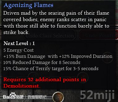3 痛苦之焰 被覆盖全身的火焰痛苦的灼烧到发疯,那些分散精力于痛苦和仍然能活动的敌人几乎不能再反击。 5能量消耗 +15%灼烧伤害(+12%持续时间) 10%减少伤害8s 15%概率震慑目标3-5s。