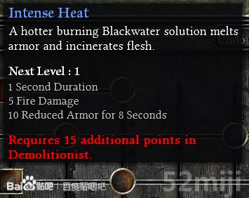 2 高温 一种高温灼烧的黑色液体融化护甲并焚烧身体。 1级 1s持续时间 5点火焰伤害 10点护甲减少8s。