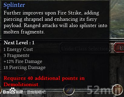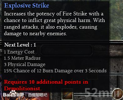 2 爆裂 增加火焰打击的潜力,有概率造成高物理伤害。由于是范围伤害,它也会爆炸,对周围敌人造成伤害。 1级 1能量消耗 1.5m半径 3点物理伤害 15%概率12点灼烧伤害于3s。