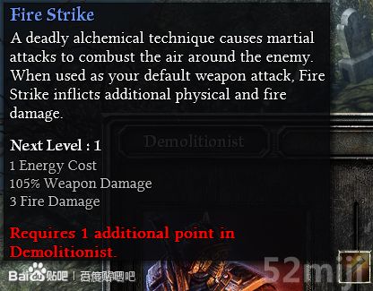1 火焰打击 一种致死的炼金技术产生攻击燃烧敌人周围的空气。默认武器攻击,造成额外物理和火焰伤害。 1级 1能量消耗 105%武器伤害 3点火焰伤害。