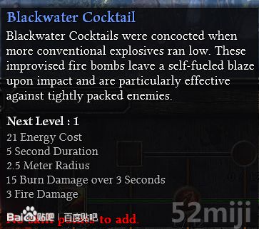 1 黑水鸡尾酒 :1级消耗21的能量 持续5秒 2.5米半径 3秒内15燃烧伤害 3火焰伤害
