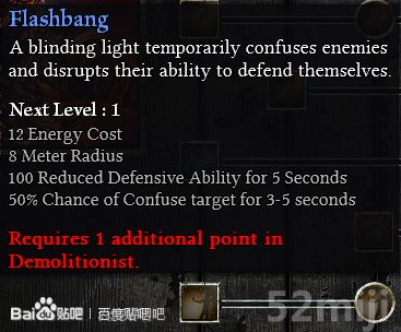 1 闪光弹:8米半径 100防守能力降低,持续5秒混淆目标的几率为50%,持续3-5秒