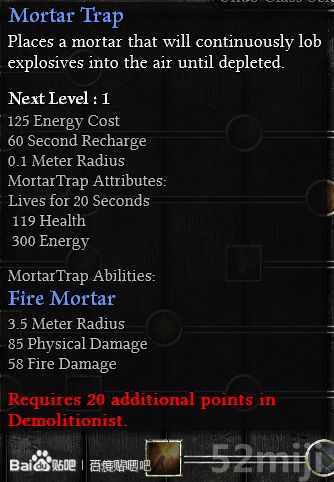1 召唤砂浆的陷阱: 85 物理伤害 58火焰伤害 119生命值 300能量