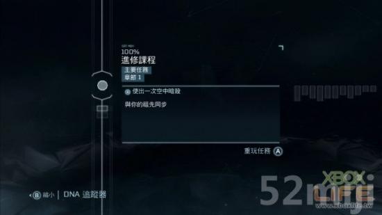按下Start,你会发现已经可进入完整的游戏选单,其中由左边数过来第三项目「DNA追踪器」可以让你知道现在故事进行到哪裡了,目前会显示「章节1」,按「放大」进去后会显示你现在的主要任务是「与祖先同步」,之后你可用「DNA追踪器」来看每个章节的主要任务、次要任务、完成度,要是玩太烂,还可以指定章节重玩。