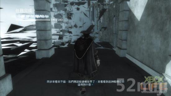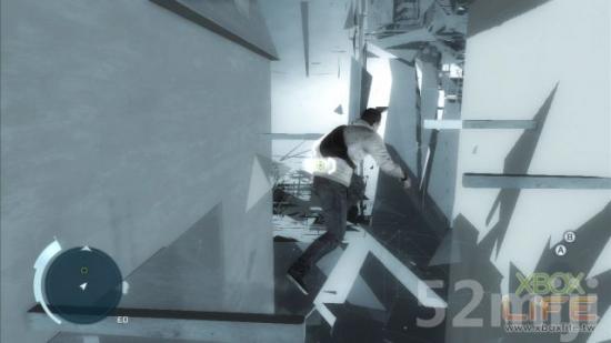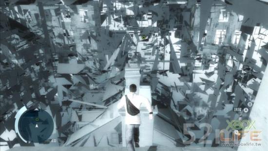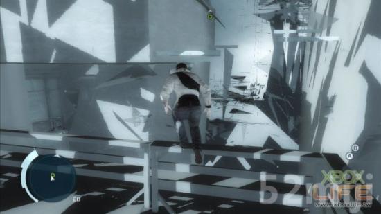 滑下去以后,接著前面又是一片乱糟糟,仔细看可发现左右牆上各有两根木梁,共四根。一样按住右扳机键往前「自由奔跑」,呆子蒙会自动跳上栏杆再飞跳过去吊在左牆第一根木梁上。