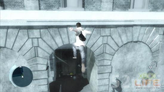 到了左牆第二根木梁上头,你会看到前头下方有个平台,这时才需要手动往前跳跃,这代落地时呆子蒙会自己受身,不用特别操作,然后一样按住右扳机键往前,呆子蒙会自动攀上栏杆跳上竿子晃到对面牆市的窗户,一路往上爬到屋顶,再一栋栋「跳房子」往前跳到一个剧院门口,这时场景开始变化,你已经完成了章节1的第一部分「进修课程」,解开「如梦初醒」成就,10分。