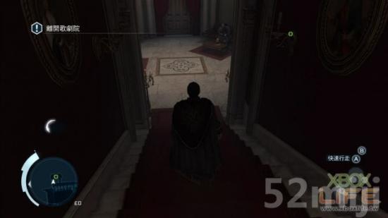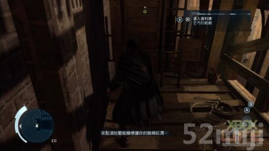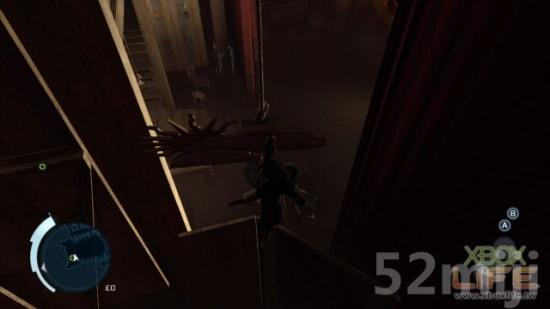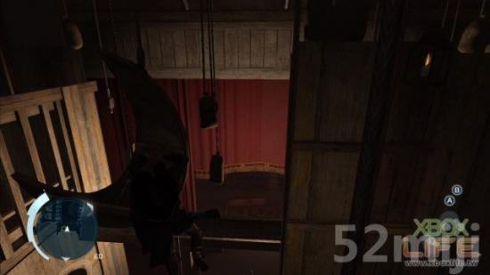 开锁后,你就进到后台,先按住右扳机键往前「自由奔跑」,自动跳攀到太阳与云的木板道具上,你会随著一起往下掉,别慌,它会停下来,然后一路往左攀过去,下头正在演「乞丐的歌剧」,一样可在「Animus资料库」看这齣歌剧的简介。