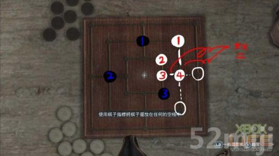 在此教各位一个莫里斯九子棋百战百胜的办法,选择先下,乍看之下,佔中间比较有优势,不过你却先故意下在两个相近的角落上,这时电脑会去抢佔与你不相邻的中间。