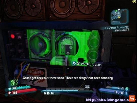 把它放入酒店的收音机,于是发出难听的声音,过会收音机变绿色后用肉搏打坏,拿出AI核心,现在你可以选择送到枪店老板那把它做成枪,或送到医生那做成护盾。
