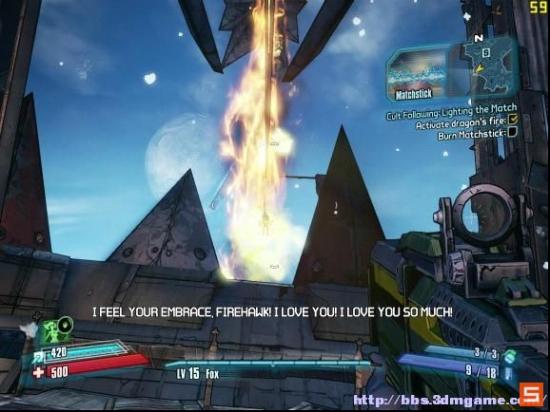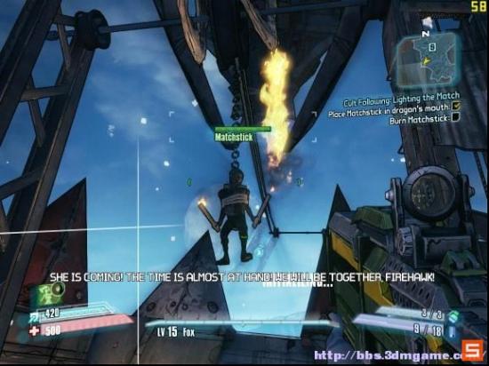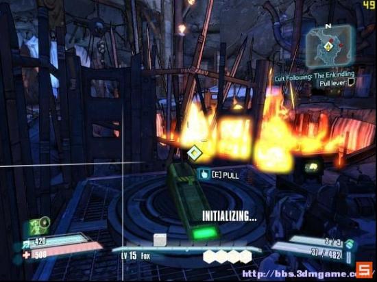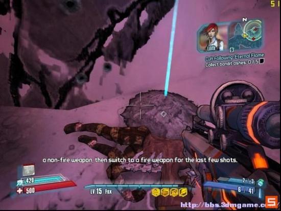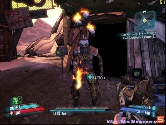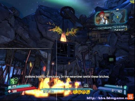 原来要烧的是被抓来的避难所的市民,这时Lilith现身带走了市民,然后你得负责善后,全杀光,交任务。(被救的市民:“寻宝猎人救了我们的命,我们要崇拜寻宝猎人!”Lilith:“……”)