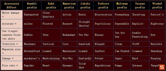 2代的prefix没有1代那么丰富了,数量上少了许多,但是更加直观了,熟悉了prefix表以后看到prefix基本就能了解枪支的属性加成了,对于我们判断枪支的好坏起到一个辅助的作用。