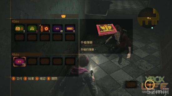 而在双人模式中的道具栏也有了一些改变,这次虽然两人的道具栏是分开的,但只要开启道具栏就能够一次看到两人身上携带哪些道具。而这时候玩家可以自由的交换两人身上的道具,例如弹药或者是药草等等,可以把另外一个人物当作临时的仓库使用,但除了武器之外。当然专司战斗的人物身上的道具格会比较多,在一开始克雷儿身上就有10个道具栏,而莫依拉身上则是只有5格。不过从系统栏位上看来,未来随著后续的集数慢慢推出,两个角色都有扩充最大道具栏的空间。而在使用道具上也变得相当方便,只要有携带草药的角色长压 RB,就能不开启道具栏而立刻使用草药,整体道具栏的方便性比起先前的作品是大大的增加,虽说比较不合理但却大大增加了玩家的使用方便性。而除了基本的道具栏之外,在游戏中也可以找到更多的弹药袋,让玩家一格栏位可以摆放子弹的最大量增加。