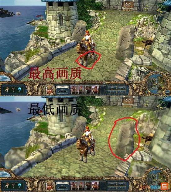高画质和低画质对比,主要是砍阴影和模糊模块贴图为主,可见还是很明显的。