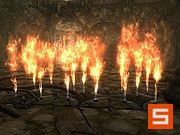 只要在火焰地砖上有压力,喷焰陷阱就持续喷出火。尸体或带火的箭都能引发此类陷阱。潜行系perk轻盈脚步能够使玩家直接通过而不激发陷阱。记住,如果在一个特殊的地砖中间少了一个黑色的菱形区域,那这里就不会喷火,可以放心的走。