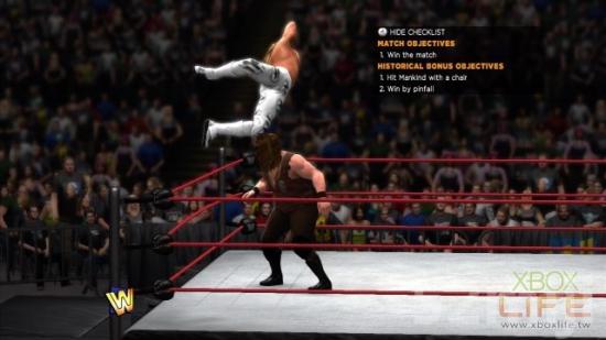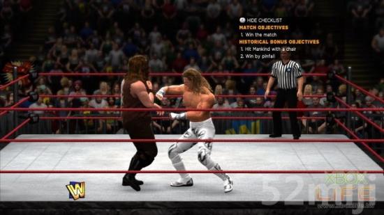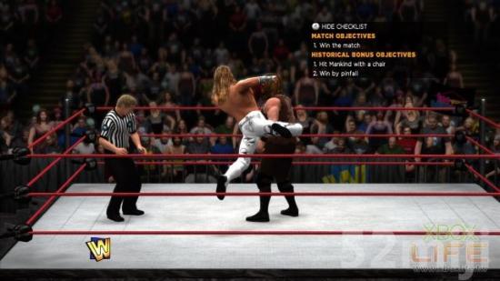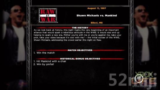 每次游戏的一开始都会告诉你一段简单的文字叙述WWE过去的赛事历史(也就是现在要你回到当时重现历史的这一场),其中也会告诉你获胜条件(并非只是打赢对手为唯一目的)