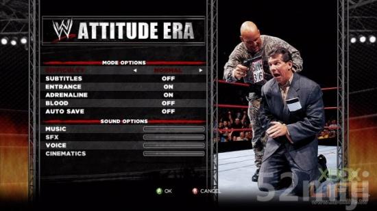 一开始进入 ATTITUDE ERA 游戏模式时可以先调整一些设定,例如流血功能可以打开(个人认为比起其他格斗游戏其实也不是那麽血腥^^)图为SCSA开枪的超经典历史画面,吓的 Vince 老板屁滚尿流~~~
