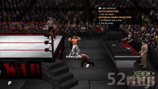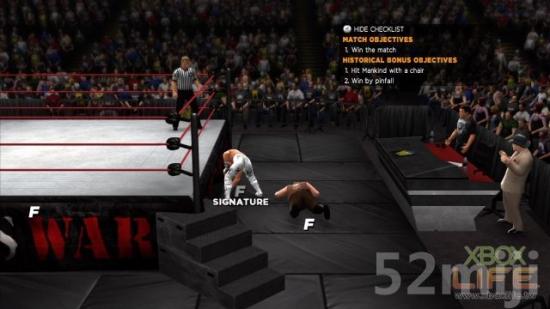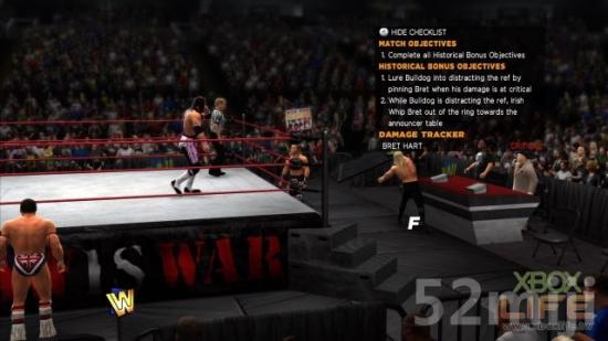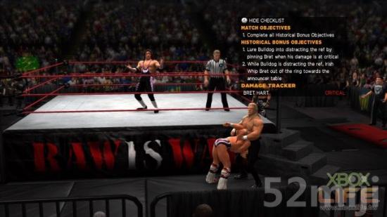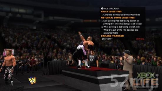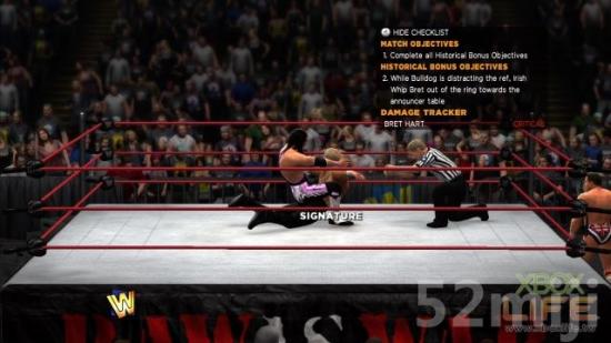 游戏中不会出现血量,基本上被打到多惨都还可以继续站起来而且依然有很大的机会可以反败为胜(这就是摔角!握拳向前~),但不要给终结技或是关节技抓到,这张是从头到尾都没有被打到一下的就把BRET打到红血后被一个关节技给逆转...凸...