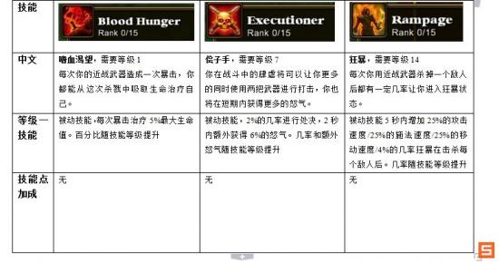 Battle Rage:图中翻译错了,第一层效果是附近敌人越多你减伤越多。可选技能,我只点了1级,无法评价。