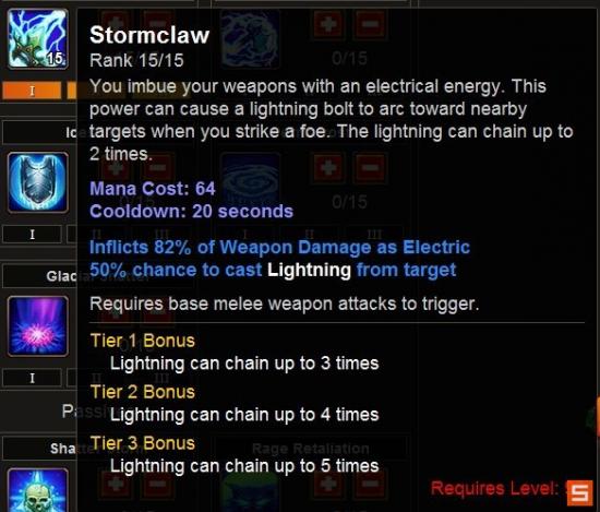 2、第二页苔原技能第二技:【暴风爪】。此乃平A狂战士代表性技能,在武器上附上闪电,平A可以触发百分比武器伤害为闪电伤害,且可以连锁溅射(而且连锁是瞬间连锁造成伤害不是慢悠悠的跳跃延迟连锁)。这是个BUFF技能,45秒持续时间,20秒CD,50%触发几率。
