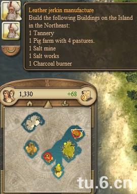 另一个任务是要你制造8个皮衣送到位于西南方8点方位的岛屿上去,来到东北1点钟方向上面建立皮革厂,猪圈,盐矿,木炭小屋,制盐工厂,集齐8个以后送过去,