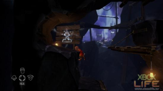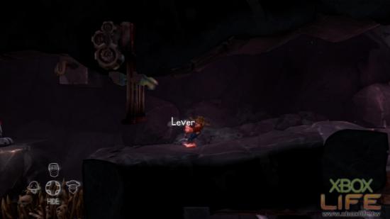 往左前进,然而道路却被一隻怪兽给挡住了,因此先往上爬看看有没有可以清除障碍的机关。