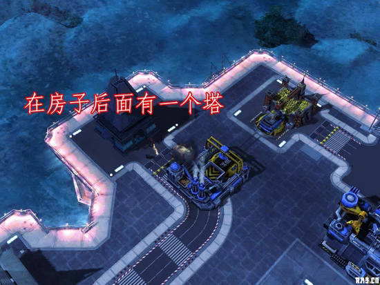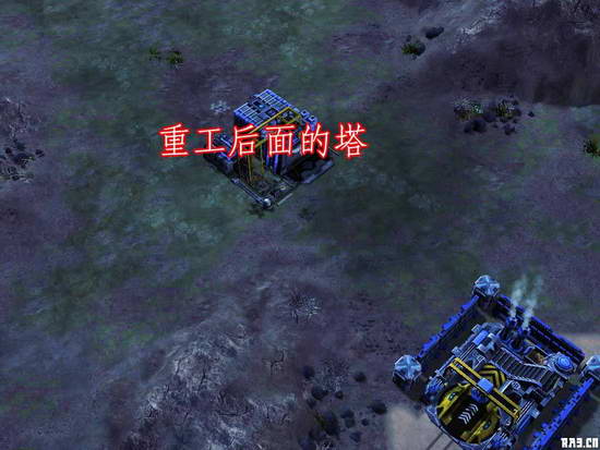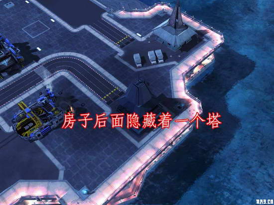 在RA2中,可以利用比较高大的建筑物(建造厂一类),在后面放塔。