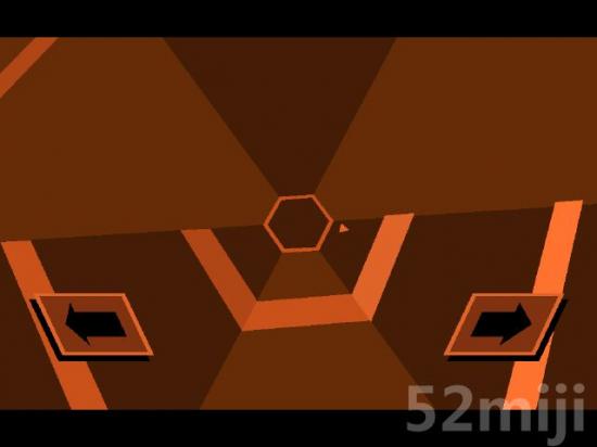 游戏的玩法非常简单,在画面中心有个空心六边形,在它外围有个小三角形,点击左边屏幕它就会沿着六边形往左移动,点击右边屏幕就会往右。游戏的过程中画面会一直旋转,随着旋转会出现实心的横条,横条会随着画面旋转着向中心收缩。而玩家要做的就是移动这个小三角躲避这些扑面而来的横条。
