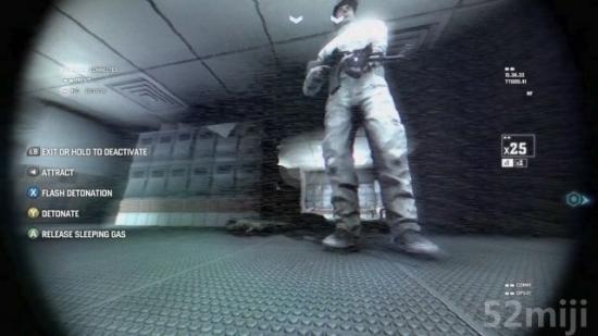 而且芭乐的口味变多了,也就是可以投掷的手榴弹种类增加很多,除了基本的手榴弹、烟雾弹和闪光弹之外,还有投掷出去后可以检视投掷目的地的「Sticky Camera 」,检视完环境后再按下引爆就可以将敌人炸飞!不过只想把人支开或是想要利用声东击西的战术时,可使用「噪音产生器」(丢一颗石头的意思...),让对方的注意力被其他的东西吸引而前往查看,尤其当你遇到像是发了疯的大狼狗时,特别需要。