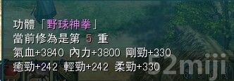 总的来说野球神拳比九阳神功好使,主加刚柔,配合降龙十八掌也不错,不枉前期内功丹苦练到35级,话说要拿九阳也不容易。