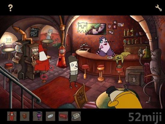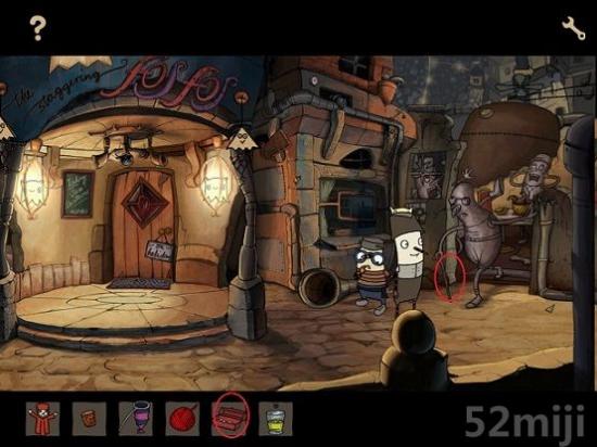 进入酒吧,对红袍僧侣座位下的转轴使用纸包鱼,然后点击僧侣衣服上的线头,得到背心材料1。对泡泡糖机器使用薄荷币,得到一把弹珠。
