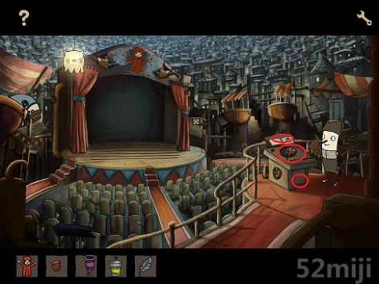 对左下角麻袋使用之前在酒吧获得的不明液体,然后与瓶塞结合,使用,得到胶水。使用麻袋上方控制台,上楼。将网兜和胶水放在红衣模型的右手上,下楼,