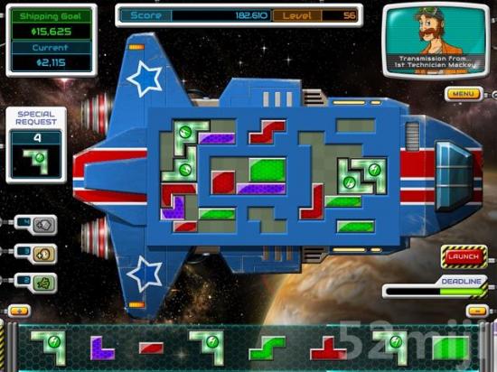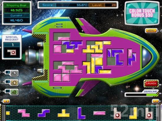 玩家通过拖动不同形状的方块(货物)置于太空舱内,俄罗斯方块大家玩过,不过本游戏可不会消除掉正行,玩家要尽可能的将方块排的紧凑,游戏有最低目标分数,玩家必须达到才可过关。鼠标右键可旋转方块,当下方所有方块都不能填充到舱内的有效空间(最低两格)时,玩家可点击左下方回收站按钮,将出现全新一行的方块。