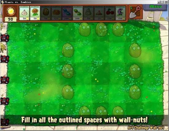 前两个僵尸窝瓜土豆伺候,剩下的就狂种墙果食人花。利用食人花的快CD在第一排墙果背后铲了种种了铲。。。。。。(食人花:。。。。。。我得罪你了啊?),神速达成。