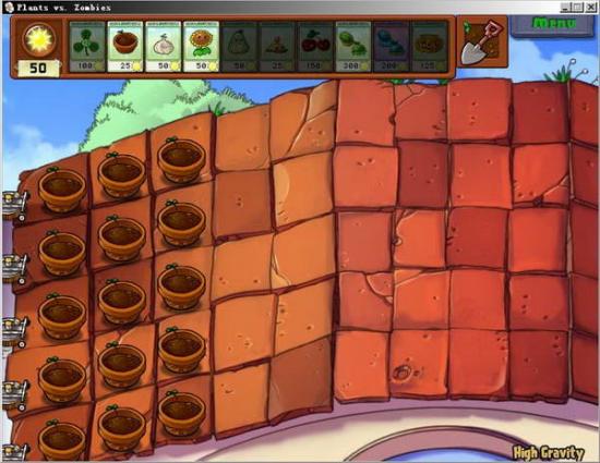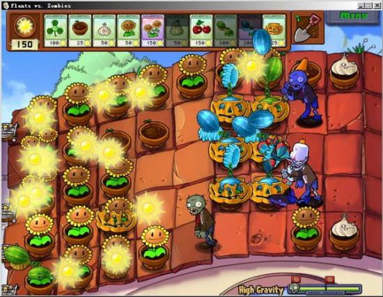 由于高重力的缘故,投掷植物不能放后排只有丢前面,一开始就要选好花盆位置,一五路大蒜开局是必须的,三路先出冰瓜,减速了就好打,窝瓜炸弹土豆一直都要用,用着用着冰瓜码好两排了本局也就基本拿下。补补南瓜就可以,僵尸多了直接花盆秒炸。